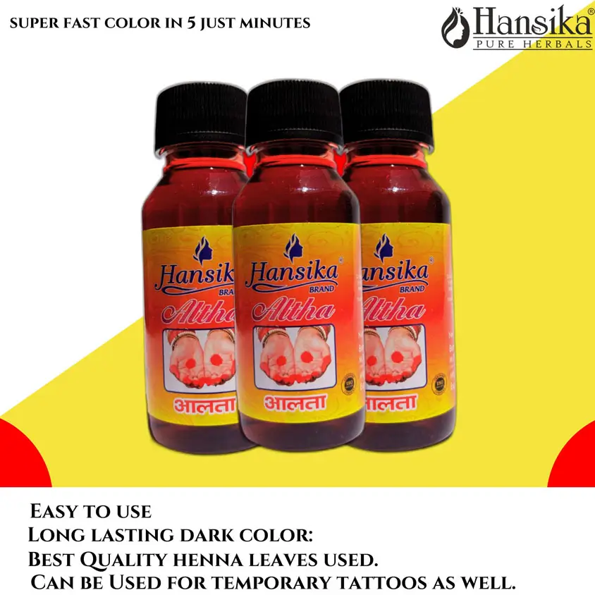 Hansika Altha 60ml is a traditional decorative product used for artistic designs on hands and feet. Its deep, rich color is perfect for cultural and festive occasions.