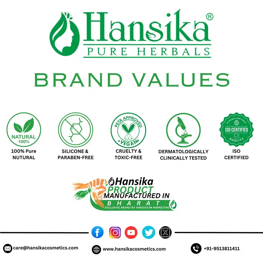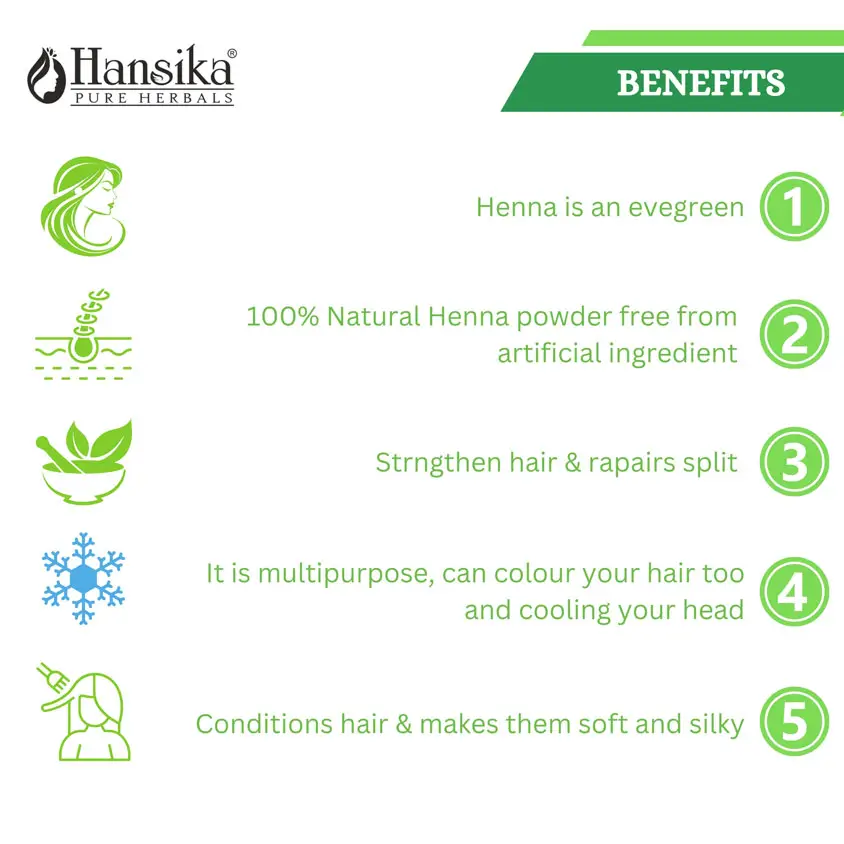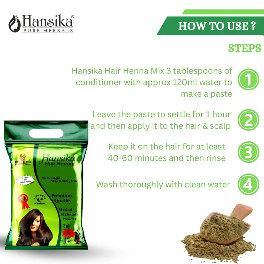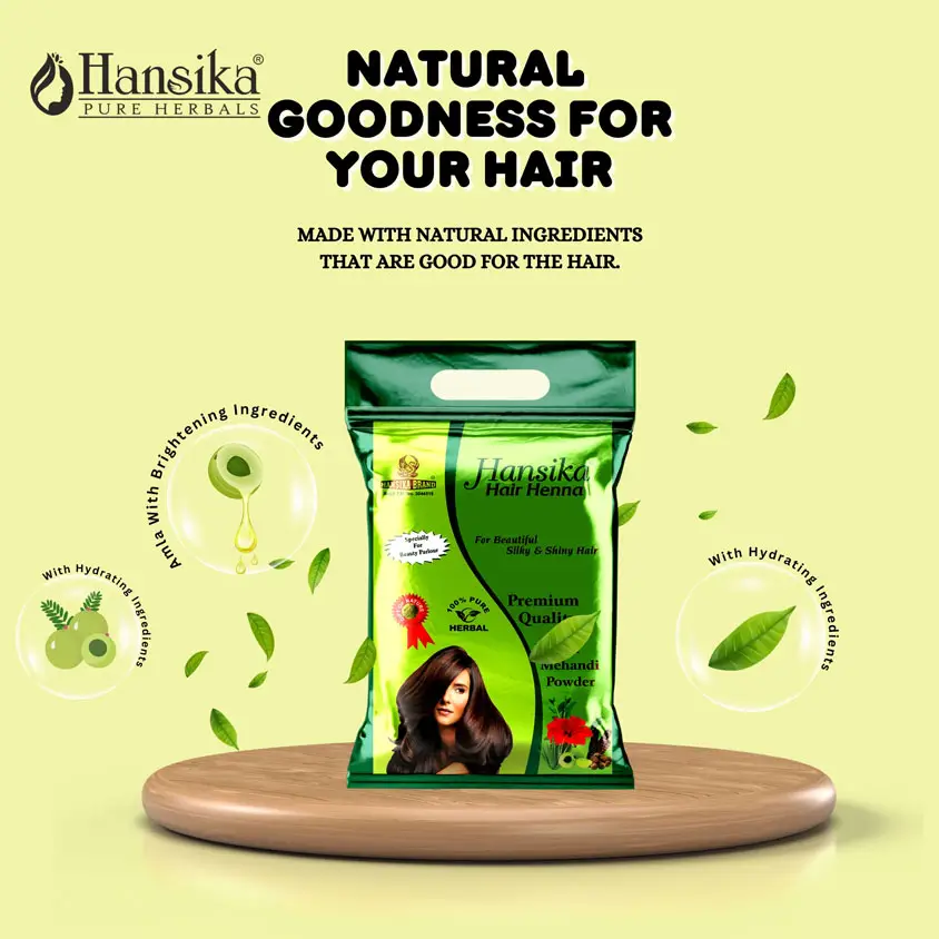 Hansika Hair Henna 500 gm is enriched with herbal goodness for deep nourishment. It covers grays effectively, leaving hair with a rich, vibrant color and improved health.