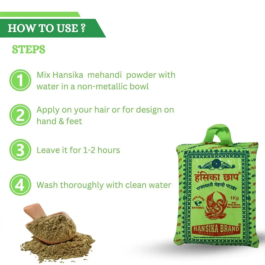 Hansika Kapda Mehandi 1 kg is a chemical-free, natural solution for fabric dyeing. Its fine texture and rich pigment ensure uniform coloring, perfect for large-scale use.